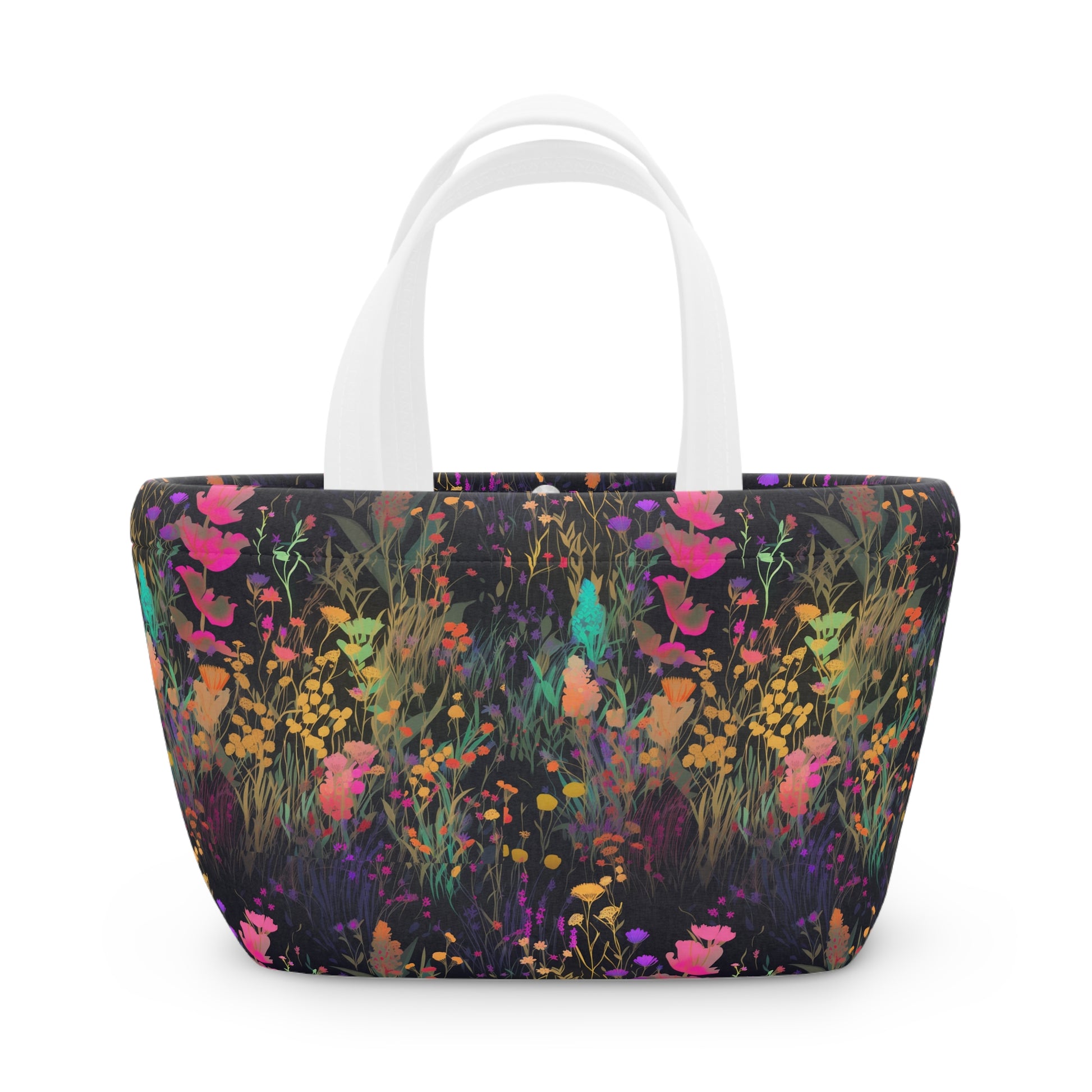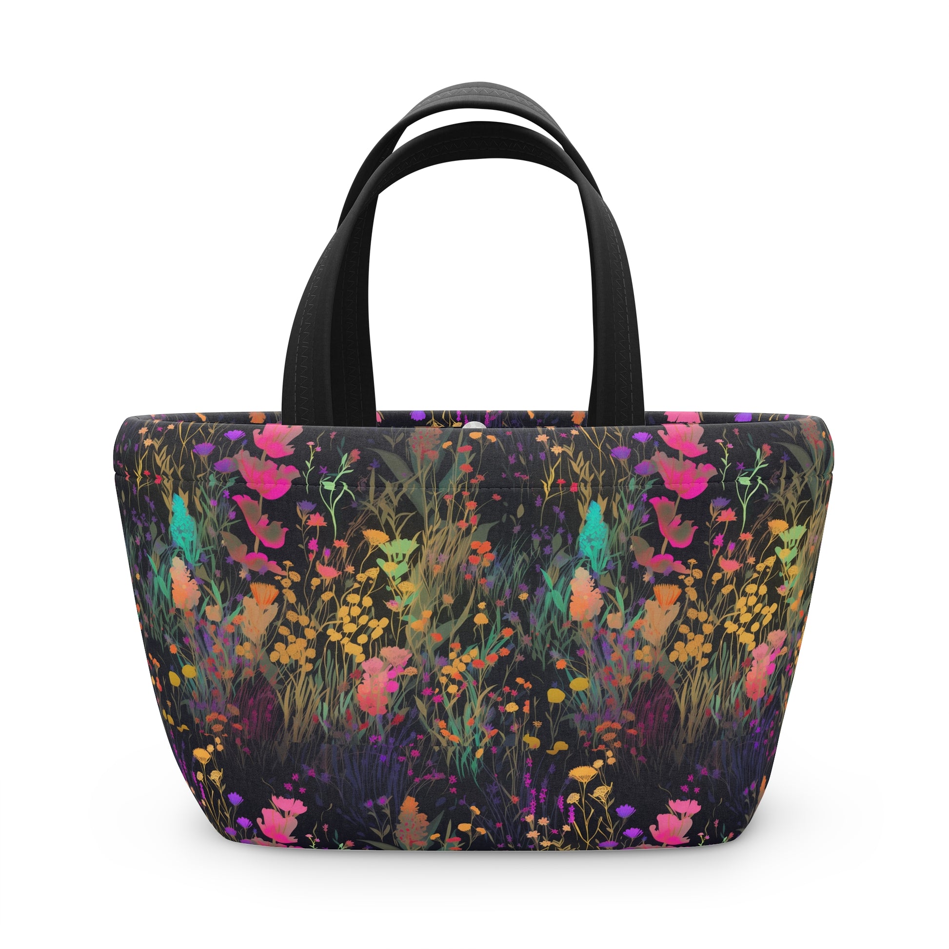 Artsy, bright florals on black lunch bag. A great addition for the work fridge, it is soft yet sturdy, they have a comfortable handle and a flat bottom, so no food gets squished during the day. The spacious main compartment will easily fit a three-course meal plus some appetizers. .: Material: 100% neoprene (95% polyester, 5% spandex) .: One size: 9.3'' × 7.7” × 4.7” (23.6 cm × 19.6 cm × 11.9 cm) .: Double bar handle .: Large internal compartment for storage .: Magnetic button closure .: Curved shape with flat bottom