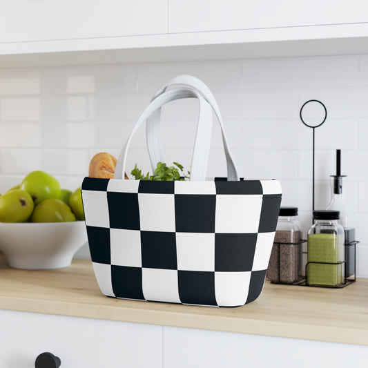 Black and White Checkered Ladies Lunch Bag - Elegant and Minimalist Neoprene Insulated Purse Lunch Box